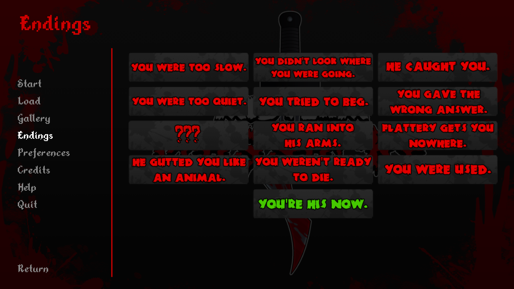This game is so much fun and I absolutely love it! I am struggling to get the top middle ending ;( But i will not give up keep up the good work
